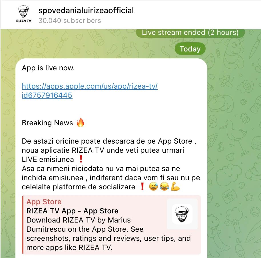 Cristian Rizea a anunțat lansarea noii aplicații RIZEA TV, disponibilă începând de astăzi pe App Store. Noua platformă le oferă utilizatorilor posibilitatea de a urmări LIVE emisiunea, oricând și de oriunde, direct de pe telefonul mobil.