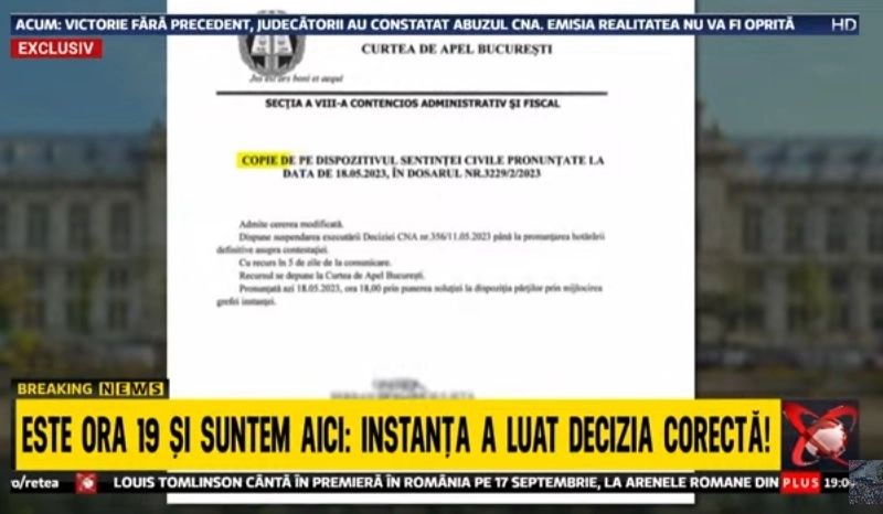 - 17:44 - Victorie pentru Realitatea PLUS: Curtea de Apel București a decis să suspende decizia CNA prin care se ridică licența postului. Televiziunea Poporului NU se închide