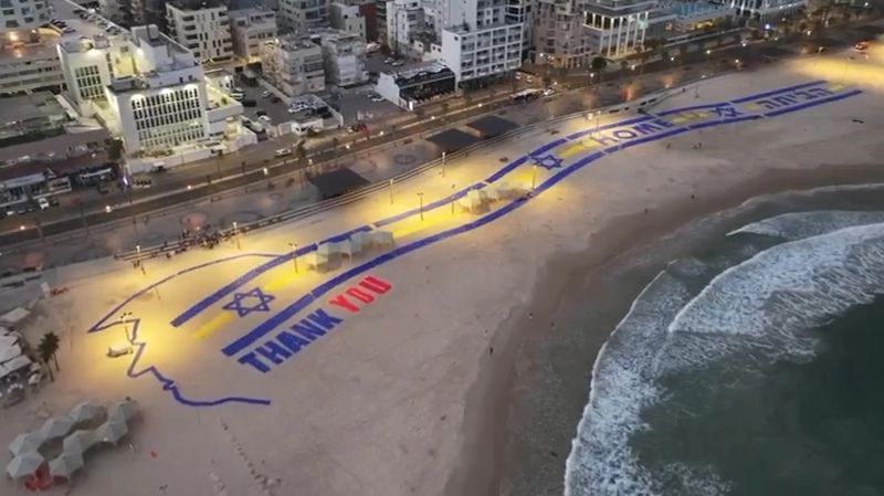 Președintele american Donald Trump este așteptat luni cu un mesaj uriaș de mulțumire ce se poate observa pe plaja din Tel Aviv, potrivit imaginilor difuzate de Channel 12, relatează The Times of Israel.